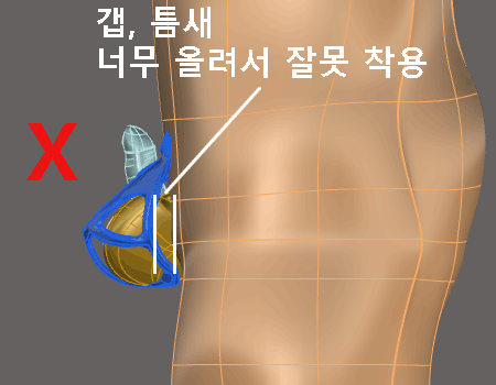 4. 돔의 양 옆 곡선이 서혜부에 밀착이 안됐다는 것은 너무 올려서 착용했다는 뜻입니다. '돔'이 거의 하방에 위치하게 내려서 착용한다.